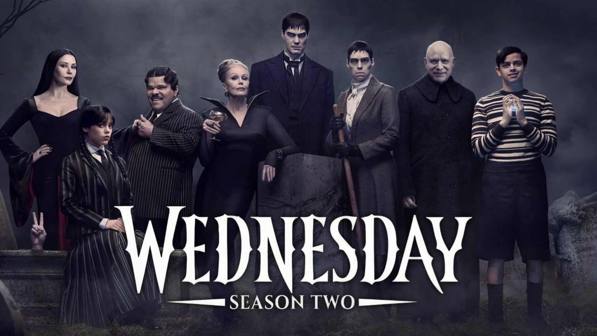 Stars: Jenna Ortega (Wednesday Addams), , Steve Buscemi (Barry Dort), , Hunter Doohan (Tyler Galpin), , Emma Myers (Enid Sinclair), , Joy Sunday (Bianca Barclay), , Isaac Ordonez (Pugsley Addams), , Moosa Mostafa (Eugene Ottinger), , Owen Painter (Slurp), , Georgie Farmer (Ajax Petropolus), , Billie Piper (Isadora Capri), , Luyanda Unati Lewis-Nyawo (Sheriff Ritchie Santiago), , Victor Dorobantu (Thing), , Noah B. Taylor (Bruno), , Evie Templeton (Agnes DeMille), , Luis Guzmán (Gomez Addams), , Catherine Zeta-Jones (Morticia Addams),